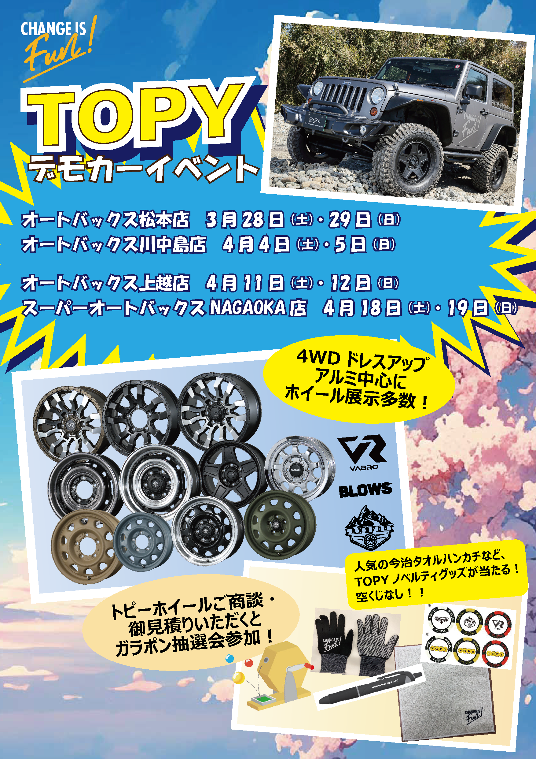 3/28(土)~4/19(日)長野県・新潟県のオートバックス様でラングラー展示致します